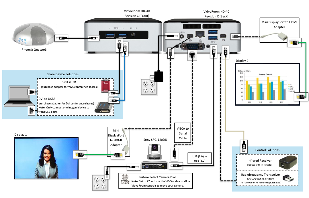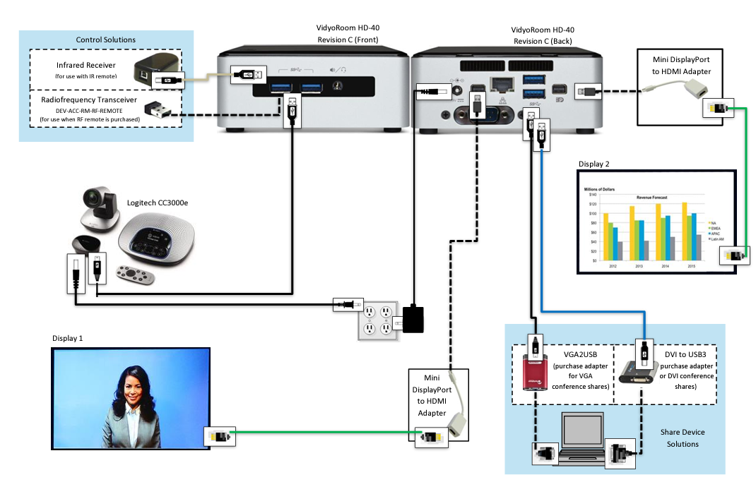 - For a list of peripherals compatible with the HD-40C and other room models, see Supported peripherals for VidyoConnect Room and VidyoRoom systems.