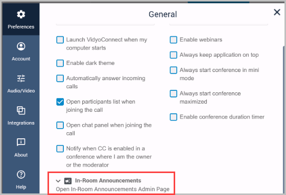 - We’ve added support for in-room announcements in our VidyoRoom systems (VidyoRoom, VidyoConnect Room, and VidyoConnect Room SE).