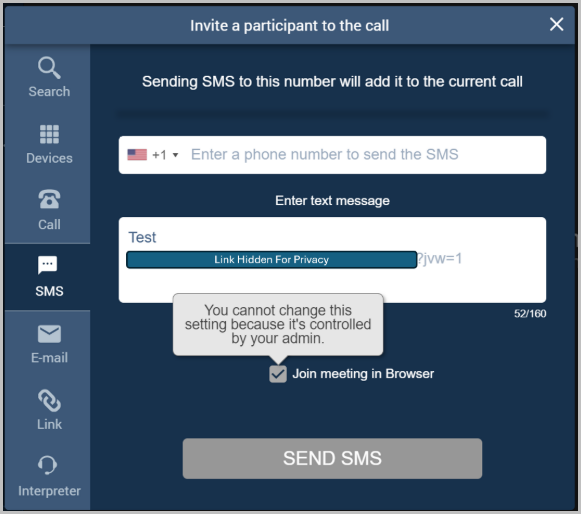 Note The SMS invite feature in VidyoConnect desktop has a provision of modifying the text to include the jvw parameter at the tenant admin level. If this is enabled, it will automatically be enabled at the desktop, and the user will not be able to uncheck this. Please see the attached image. |